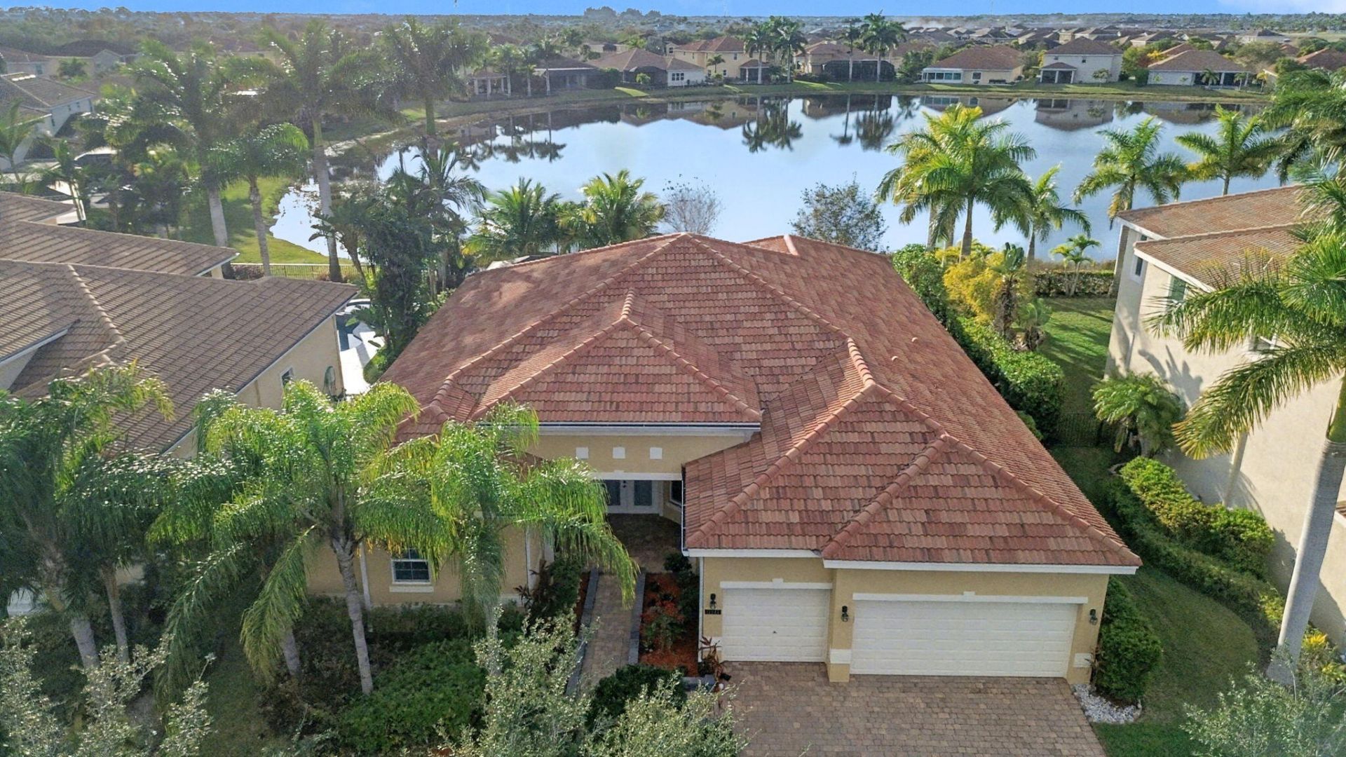 Experience waterfront living in this elegantly updated 4-bedroom plus flex/ 5th bedroom lakefront home, in the prestigious Estates at Tradition. Featuring high ceilings and 10 foot doorways, this spacious home features a collection of high-end improvements. Enjoy seamless indoor-outdoor living on the extended, fully enclosed screened lanai. West-facing exposure offers breathtaking sunset views over the tranquil lake. The large kitchen boasts new premium appliances installed between 2023 and 2024, including a refrigerator, dishwasher, microwave, and water heater, providing modern efficiency and peace of mind. Hard floors throughout provide a clean, contemporary, and low-maintenance interior. Residents of the Estates at Tradition enjoy access to scenic walking trails and is just a short walk from the home, enhancing the walkable, resort-style lifestyle that makes Tradition so desirable. Situated in one of Tradition's most desirable estate communities, this exceptional lakefront residence offers a rare blend of luxury, privacy, and thoughtful upgrades in a truly premier setting.